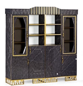 کتابخانه مدل M02 با طراحی لوکس و تلفیق رنگ مشکی و طلایی، مکمل کامل میز مدیریتی این ست است. با قفسههای جادار و دربهای شیشهای، علاوه بر زیبایی، فضای مناسبی برای نگهداری کتابها، مدارک و لوازم تزئینی فراهم میکند.